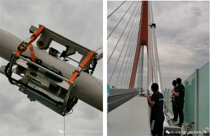 經(jīng)過一年的不懈努力,由我公司牽頭研發(fā)的橋梁爬索機器人已實現(xiàn)實橋檢測功能。該機器人包括主框架、爬行機構(gòu)、攝像頭、端部感應(yīng)傳感器、索力傳感器及自動貼緊機構(gòu);索力傳感器自動貼緊機構(gòu)可精確地控制索力傳感器和拉索緊密貼合,實現(xiàn)對橋梁拉索索力精準采集。爬索機器人設(shè)備和控制系統(tǒng)間采用無線通信,實現(xiàn)遠程控制及數(shù)據(jù)傳輸。頂部設(shè)置攝像頭拍攝橋梁拉索外觀圖像,距離編碼器采集設(shè)備爬行距離,距離在與圖像實時同步更新以實現(xiàn)拉索外觀圖像的直觀展現(xiàn),也便于后期檢測人員通過回放視頻對外觀病害成因進行詳細分析?;谠撛O(shè)備具有檢測效率高、檢測參數(shù)多、可靠性強、能耗低、使用和維護成本低等特點,其可適應(yīng)國內(nèi)各種斜拉橋、纜索橋、拱橋索桿外觀及索力檢測。