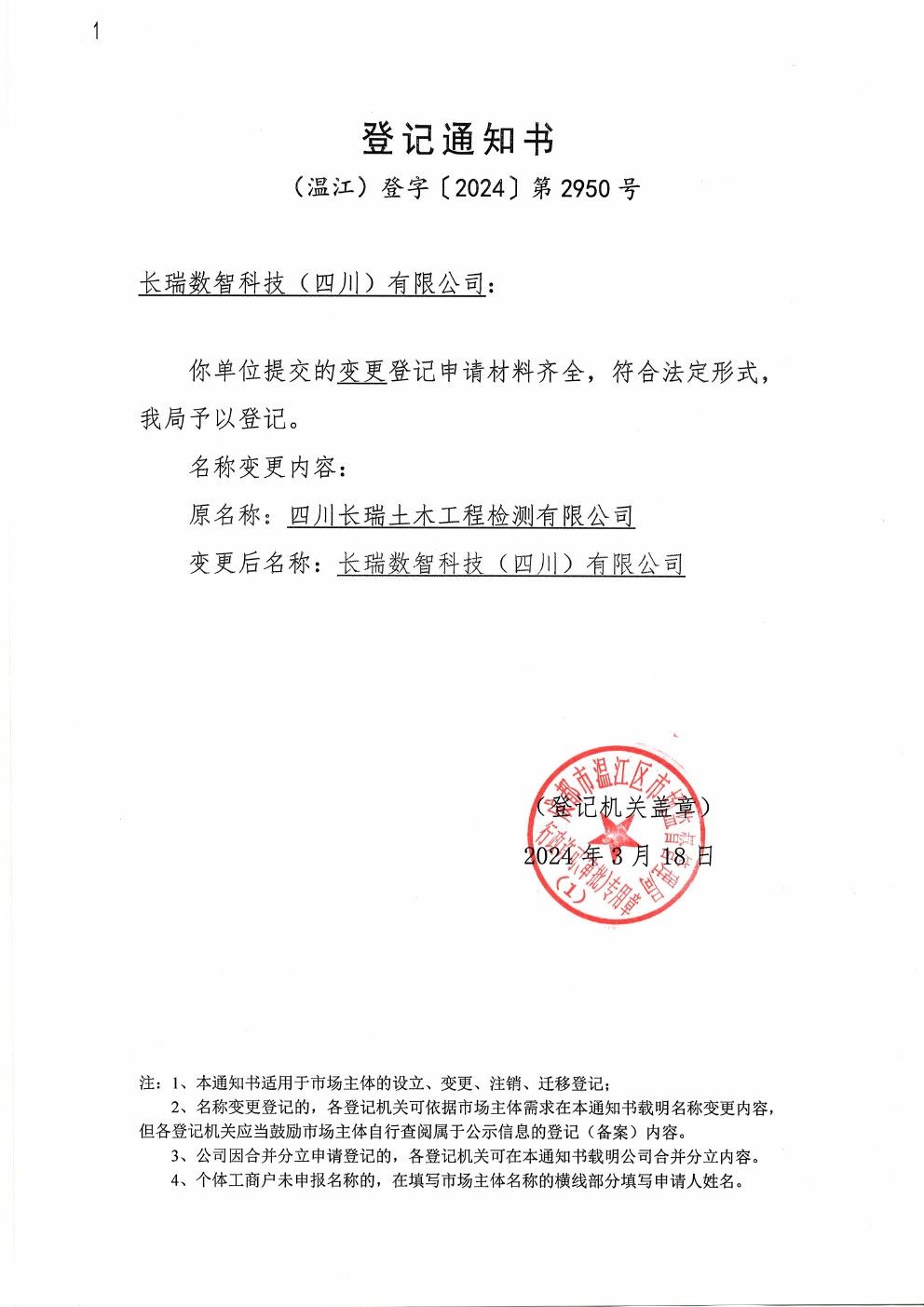 關(guān)于“四川長瑞土木工程檢測有限公司”更名為“長瑞數(shù)智科技(四川)有限公司”的通知