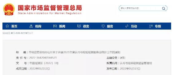 據(jù)國家市場監(jiān)督管理總局官網(wǎng)消息,2021年度認(rèn)可與檢驗(yàn)檢測服務(wù)業(yè)統(tǒng)計(jì)工作現(xiàn)已開展,市場監(jiān)管總局認(rèn)可檢測司負(fù)責(zé)認(rèn)可與檢驗(yàn)檢測服務(wù)……